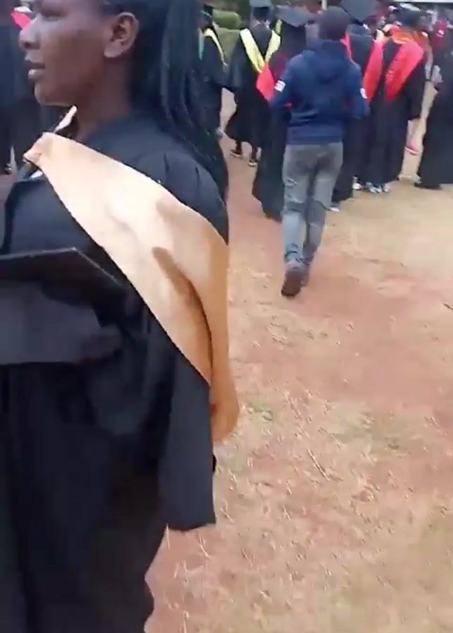 People wearing black graduation gowns and mortarboards are walking on a path. Some of the gowns have colored stoles in red and yellow. The path is dirt and grass. A person in casual clothing is walking among the graduates. A red banner with white lettering is visible in the background.