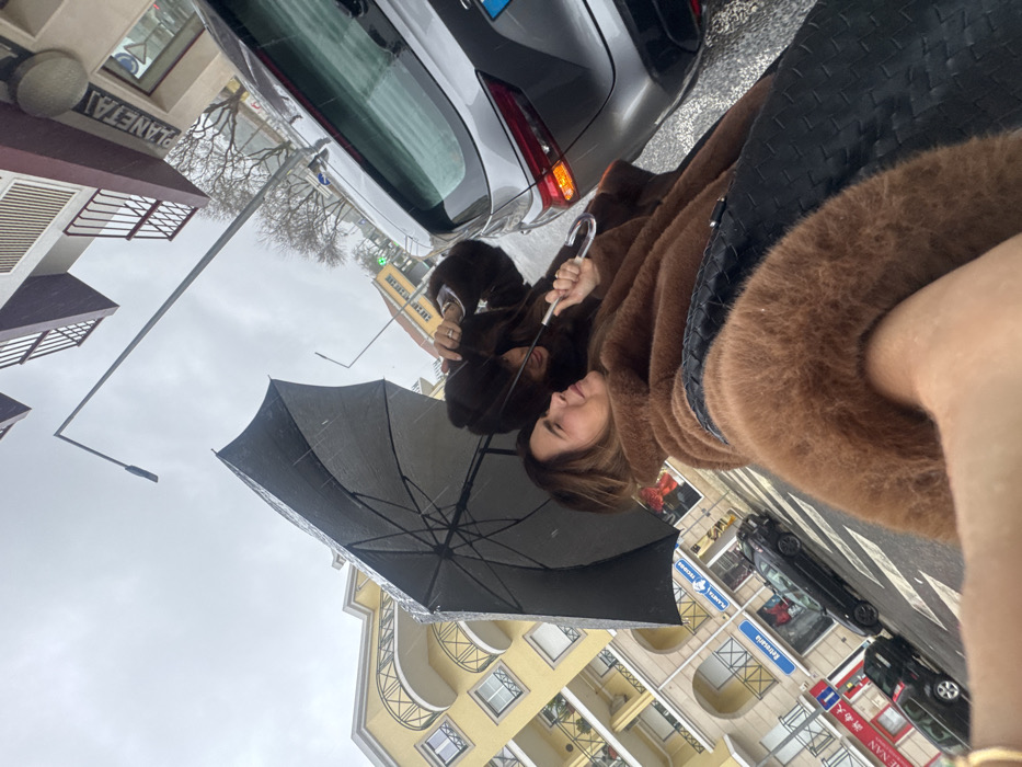 Two individuals are captured in a close-up, angled photograph on a city street in Torres Vedras, Portugal, under overcast and rainy conditions. The person in the foreground, positioned to the left, has light brown hair and is seen in profile, looking towards the right with a slight smile. She wears a brown, fluffy, long-sleeved coat and has a black, woven bag on her left shoulder. Her right hand, partially visible, holds the device capturing the image, revealing a gold-colored bracelet on her wrist. Immediately behind and to the right of the first individual, a second person is partially visible, also wearing a similar brown, fluffy coat. This individual holds the silver handle of a large, dark grey or black open umbrella over both subjects. Water droplets are visible on the umbrella's surface, indicating active rainfall. The background shows a narrow city street with parked vehicles and multi-story buildings. To the immediate right, the rear of a light grey SUV is parked, with its taillights and part of the license plate frame visible. Further down the street on the left, a black hatchback is parked. Buildings along the street feature commercial establishments on their ground floors with Portuguese signage, including "BANCA NACIONAL," "RETRATO," and "CHE NAN" on a yellow building with balconies, and "PLANETA" on a building with maroon upper floors. A tall streetlamp post is prominent in the upper background against a grey, cloudy sky. The pavement appears wet from the rain.