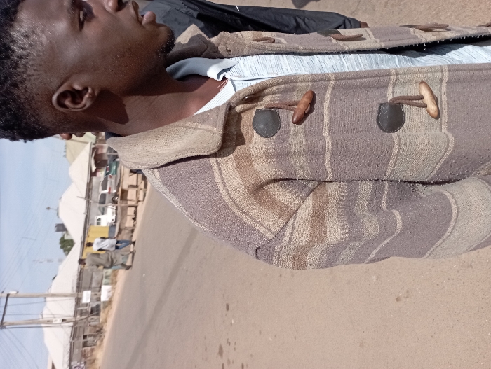The image depicts a daytime outdoor scene on a paved road in the city of Unknown, Unknown. In the foreground, positioned right-of-center, an adult male of African descent is visible from the chest up, facing right and slightly away from the camera. He has short, dark hair and is wearing a light blue collared shirt under a brown and beige striped coat. The coat features a collar, long sleeves, and three visible dark circular patches with light-colored wooden toggle buttons. In the midground, two adult male individuals are walking away from the camera on the paved road. The individual closer to the foreground is wearing a light-colored, long garment, while the second individual is wearing a light-colored t-shirt and dark trousers. The background features a row of buildings with light-colored, possibly metal or corrugated, roofs, some of which are equipped with what appears to be barbed wire fencing. Parked vehicles, including a white van, are visible in front of these buildings. Utility poles with overhead wires are present against a clear, bright blue sky. The road surface is light-colored and appears dusty or sandy in areas. Wooden structures, possibly market stalls or tables, line the roadside in front of the buildings.