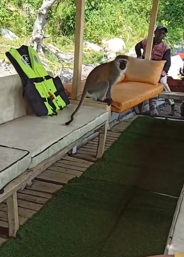 The scene unfolds on a wooden boat, sheltered by a roof. A monkey is the central focus, positioned on a cream-colored cushion of a built-in seating arrangement. Adjacent to it is a bright yellow and black life vest. To the right, another cushion of a different seating area is visible. A man wearing a hat and colorful shirt stands at the back of the boat, partially obscured by the seating. Artificial green turf covers the floor area. The surroundings include lush vegetation on the shoreline. The camera angle is slightly high, offering a comprehensive view of the boat's interior and partial outdoor setting.