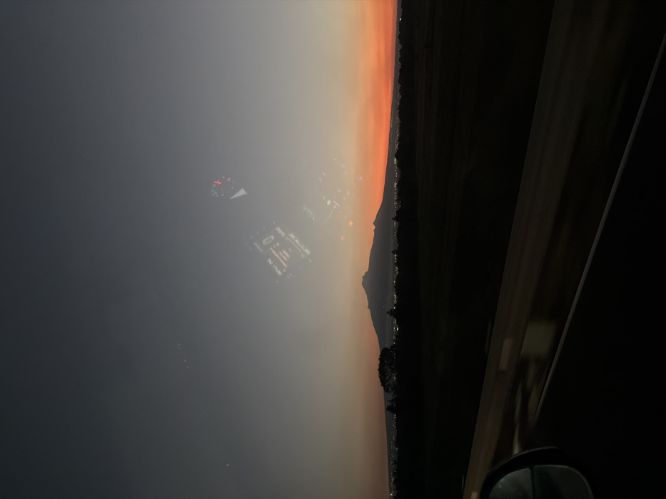 The image displays an exterior landscape observed from the interior of a moving vehicle at twilight, likely at dusk, from the vicinity of Zacatelco, Tlaxcala, Mexico. The horizon is dominated by the silhouette of a large mountain, identifiable as La Malinche, positioned centrally against a sky gradient. The upper sky is dark grey, transitioning to vibrant orange and red tones directly above the horizon. A band of faint urban lights is visible at the mountain's base. The foreground consists of a dark, indistinct field or land area, with a blurry, dark horizontal element suggesting a road or barrier. Reflections are prominent on the vehicle's window, including the partial outline of a dark side-view mirror in the lower-left corner. Centrally in the sky area, a reflection of a vehicle infotainment or dashboard screen is visible, displaying discernible, albeit unreadable, text and icons. A distinct red indicator light is reflected in the upper-right portion of the image. Several small, bright points, indicative of stars or planets, are faintly visible in the upper-left quadrant of the sky.
