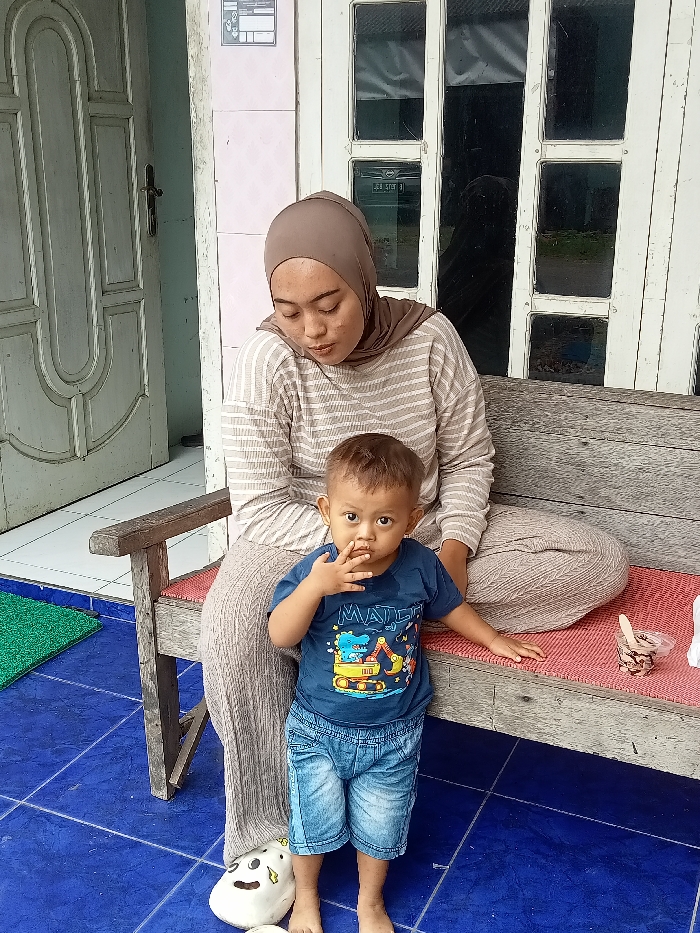 A woman wearing a hijab and striped shirt sits on a wooden bench with a child standing in front of her. The child wears a blue shirt and jean shorts, with one hand to his mouth. A white shoe sits on the ground next to the child. The background shows a door and a window, with blue tiled flooring in the foreground. A small container with a spoon is on the bench beside the woman.