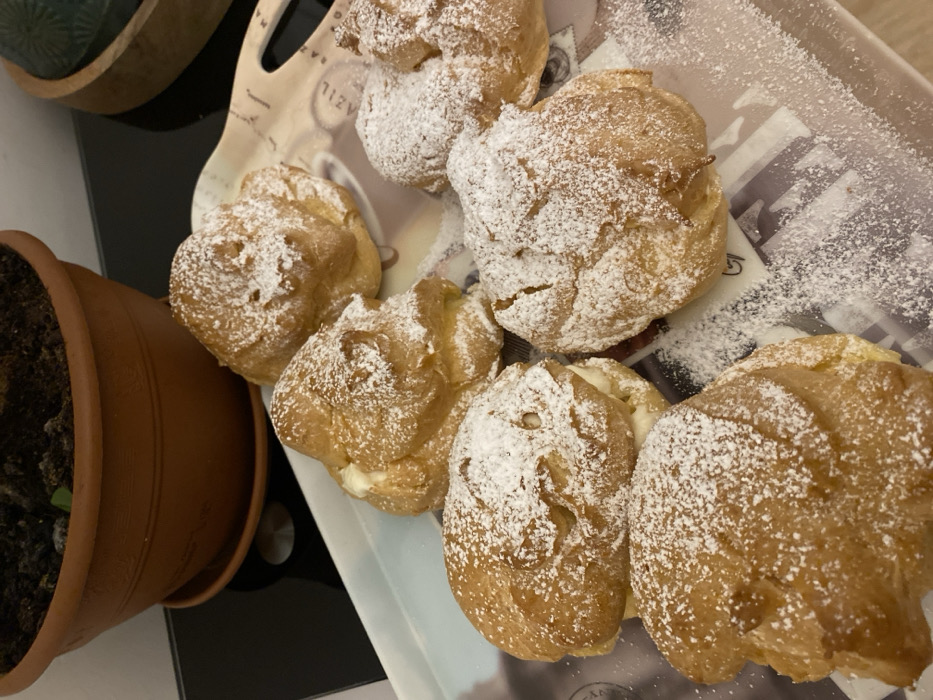 - "A tray holds several cream puffs, generously dusted with powdered sugar" by FM-TZ4Tw1, licensed under CC BY 4.0