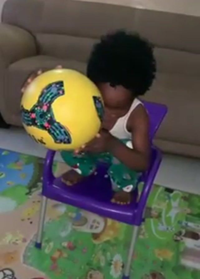 A young child with dark curly hair, wearing a white tank top and green patterned pants, is seated in a small purple plastic chair on a colorful playmat. The child holds a yellow soccer ball with black and teal markings in their lap. They then lean forward to place the ball on the floor. Behind the child is a beige couch. The room appears to be a living space.