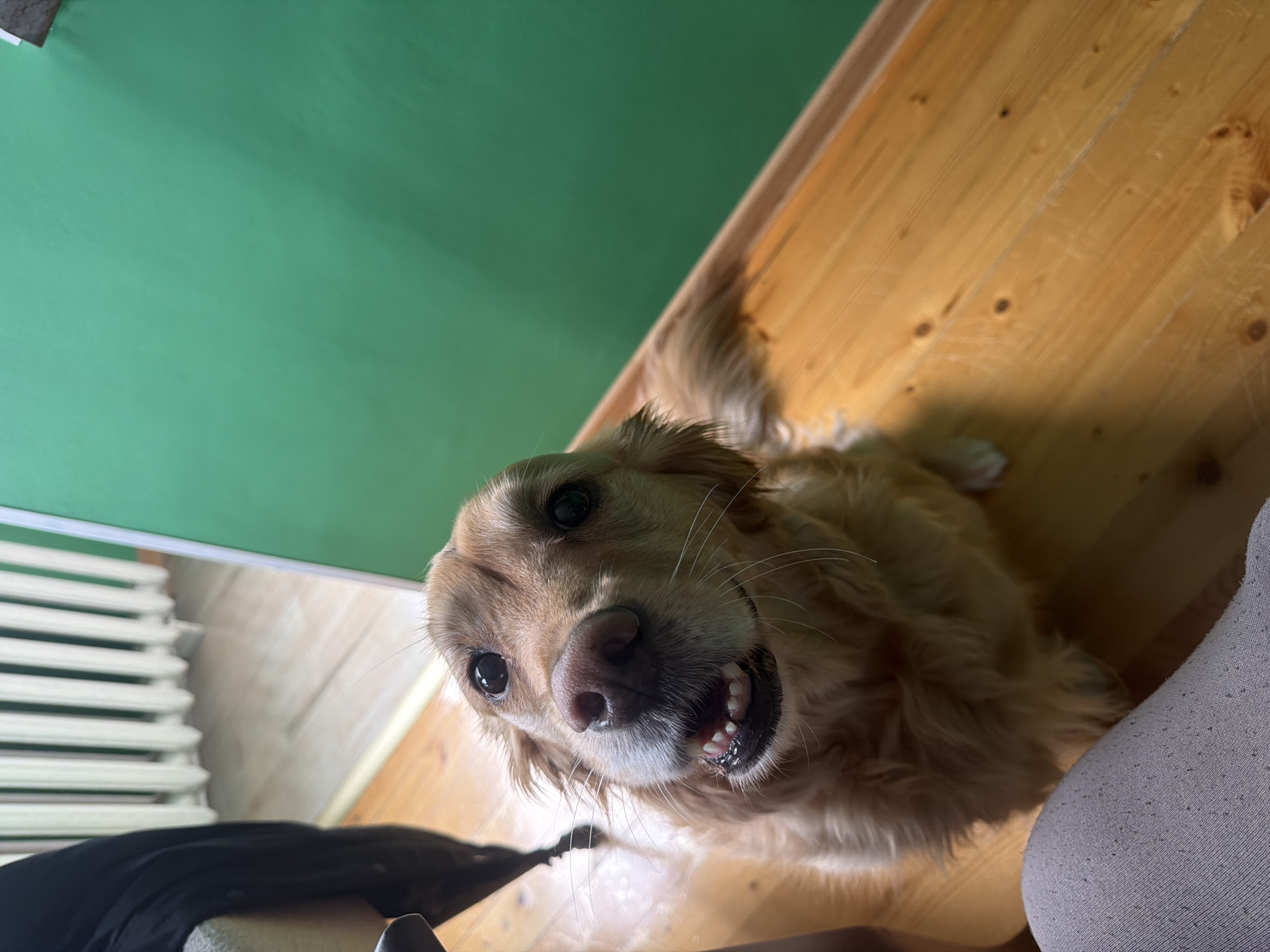 The image displays an indoor scene featuring a golden retriever dog in the foreground, positioned on a light brown wooden plank floor with visible grain and knots. The dog, which has light brown fur, is looking directly upwards at the camera, its mouth slightly open to reveal a row of lower teeth and pink gums. Its dark eyes and wet, dark brown nose are prominent. In the lower-left foreground, a segment of a human leg, clad in light grey, textured fabric, is visible. The background to the left is blurred, revealing a white, vertically ribbed radiator and a dark, indistinct object. The background on the right consists of a plain, solid green wall. No specific visual cues are present within the image to determine a precise location within Sofia, Bulgaria.