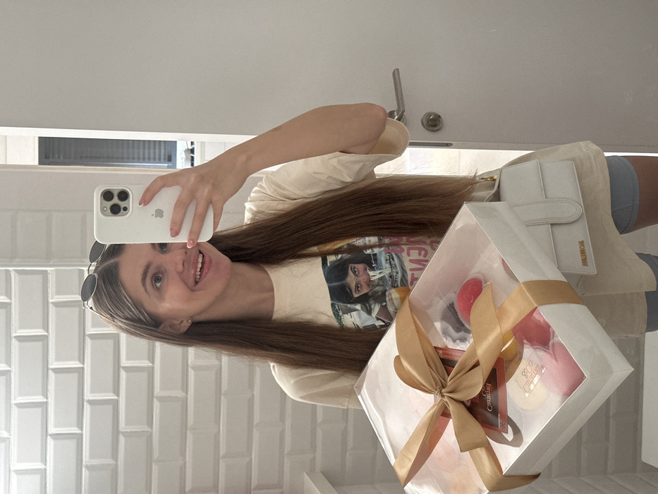 A young adult female, with long brown hair and sunglasses on her head, is captured in a mirror selfie. She wears a cream-colored t-shirt featuring a graphic print of a child eating noodles, light blue shorts, and a small white Jacquemus shoulder bag. She is holding a white iPhone with her right hand, positioned to take the photo, and in her left arm, she carries a large, clear plastic box filled with various colorful pastries or sweets, secured with a gold ribbon. A "880 Catalog" label and a chocolate bar wrapper are visible inside the box. She smiles directly into the camera. The background, visible in the mirror's reflection, consists of a white subway tile wall to the left and a plain white door with a silver handle to the right, suggesting an indoor setting in an unspecified location within Unknown, Unknown.
