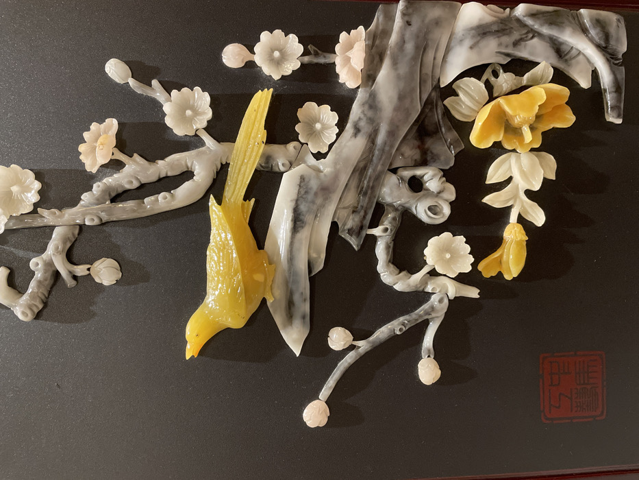 An intricate three-dimensional relief artwork, likely crafted from carved stone or shell, is depicted against a dark, reflective background. The composition features a vibrant yellow bird, facing left in profile, perched on a prominent, gnarled branch exhibiting a marbled grey, white, and black pattern. Numerous flowers and buds, rendered in shades of white, cream, and pale pink, emerge from the branches. At the lower right, larger yellow flowers with cream-colored leaves are also visible. A red rectangular seal containing stylized Chinese characters is present in the bottom left corner of the artwork. The entire piece is framed by a narrow, dark reddish-brown border. This scene is located within Kafr Sousa Municipality, Syria.