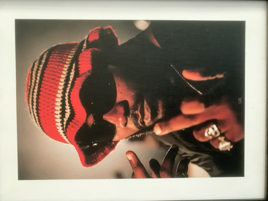 The image displays a framed, close-up portrait of an adult, male-presenting individual with dark skin and a beard/goatee
