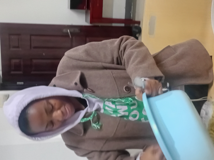 An indoor scene within Jiangjin, China, displays a dark-skinned female subject positioned centrally, actively engaged in a culinary task. She wears a light purple hooded sweatshirt with the hood up, a green t-shirt with partial white lettering, and a brown, mid-thigh length coat featuring large brown buttons. A green lanyard is visible around her neck. Her head is bowed, focusing on a light blue plastic basin held and tilted downwards in her left hand. Her right hand operates a metallic utensil, possibly tongs, over the contents being transferred from the basin to a light-colored surface below. The background features a plain white wall. To the immediate right, a dark brown, paneled door with a silver handle is visible. Further right, a dark red wooden table or cabinet holds a small, dark appliance. A light yellow or beige surface is present in the lower right foreground.