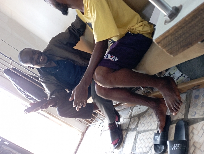 The image displays two adult males interacting in an indoor or semi-enclosed space, likely a common room or veranda, under bright natural light emanating from an overexposed opening on the left, which features metal security bars. The floor is tiled with a repeating geometric pattern of light and dark squares. The individual on the left, an adult male with dark skin, short hair, and a short beard, is seated on a light-colored bench or couch. He wears a dark blue shirt beneath an olive green or brown jacket and dark trousers, with dark sandals on his feet. He is smiling widely, looking towards the right, and holds a dark rectangular object, possibly a mobile phone, in his raised right hand. An earphone is visible in his left ear. The second individual, partially visible on the right, is also an adult male with dark skin, seated on the same or an adjacent light-colored piece of furniture. He is dressed in a yellow t-shirt and dark purple shorts bearing a white "FILA" logo. His head is tilted upwards, facing the first individual, and his left hand is open, extended towards him. His feet are bare, resting on the tiled floor, where two black slip-on sandals are present. A dark garment hangs in the upper left background, and a piece of printed material is partially visible on the floor in the lower middle. The overall scene depicts a casual, social interaction. The specific location within Jos, Nigeria, is not discernible from the visual information provided.