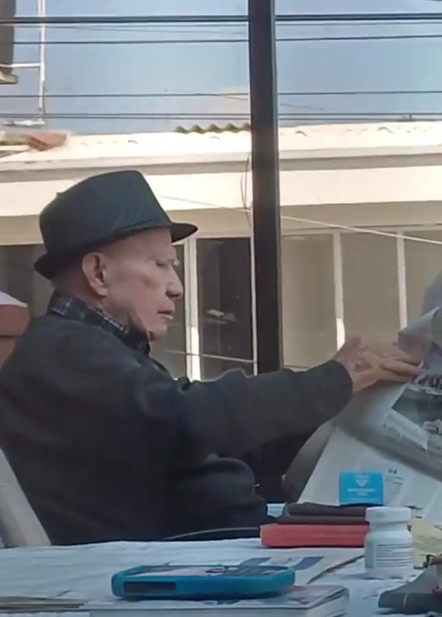An elderly man is sitting at a table outside, reading a newspaper. He is wearing a dark jacket and a dark hat. The table is covered with a white lace tablecloth. There is a blue cell phone, a red object (possibly a wallet or notepad), a small white bottle, and several books on the table. The man turns the pages of the newspaper as he reads. Behind him is a building with glass windows. There are power lines visible against a light blue sky.