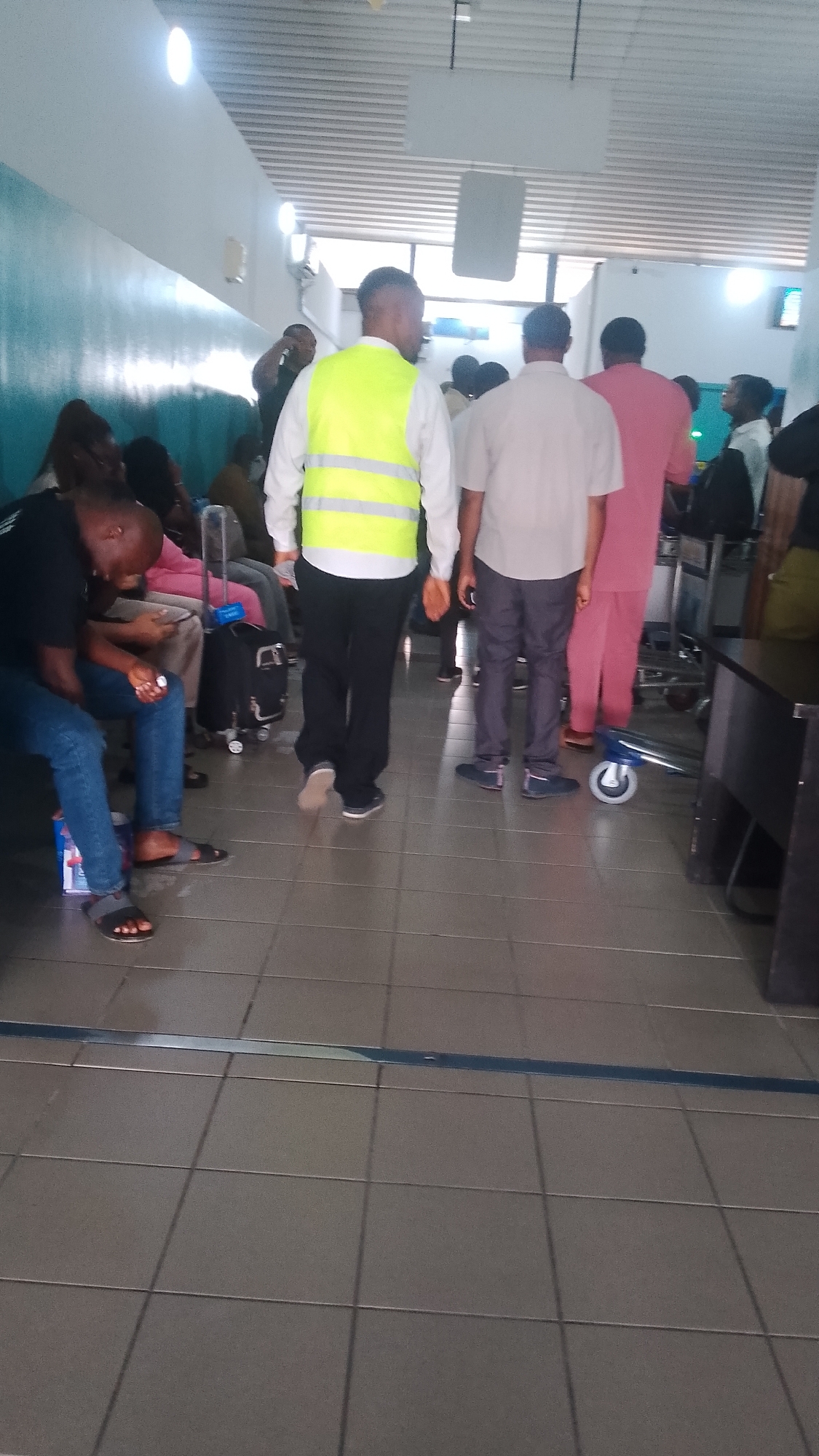 The image depicts an indoor waiting area located in Orerokpe, Nigeria. The floor is composed of light grey tiles with dark grout lines, traversed horizontally by a blue demarcation line in the foreground. The left wall features a lower section painted teal and an upper section painted white. The ceiling is white, appearing to have a corrugated or paneled design, fitted with multiple rectangular overhead light fixtures. Multiple individuals, estimated between 10 and 15, are present. In the foreground on the left, a man in a black short-sleeved shirt, blue jeans, and dark sandals is seated, looking downwards at a small white object held in his right hand. A plastic bottle rests on the floor near his feet. Behind him, a black rolling suitcase is partially visible. In the mid-ground, three men are walking away from the viewer. The leftmost man wears a white long-sleeved shirt, a bright yellow reflective vest with two silver horizontal stripes, and black trousers. The central man wears a light beige short-sleeved collared shirt and dark grey trousers. The rightmost man wears a pink or light red shirt/tunic and matching trousers. In the background, several individuals are seated along the left wall, some partially obscured. On the right side of the frame, additional individuals are standing, with a silver luggage cart visible among them. A dark-colored desk or counter is positioned on the far right. No direct interactions between individuals are clearly discernible.