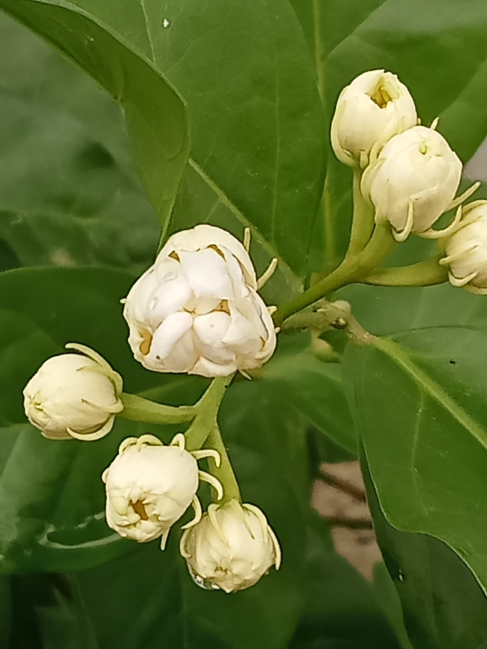 A cluster of jasmine flower buds dominates the view, showcasing varying stages of bloom