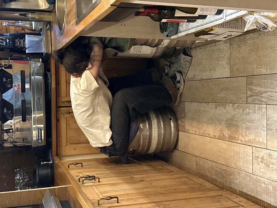 The image depicts the interior of a commercial establishment, likely a cafe or bar, in Yerevan, Armenia. A person, wearing a light-colored t-shirt and dark jeans, is seated on a purple cushion atop a silver beer keg marked "PFAND/DEPOT." The person's dark hair is tied in a bun, and their head is bent forward, resting on an unseen surface behind a wooden counter. Their feet, clad in beige and dark-colored sneakers with hook-and-loop fasteners, are visible on the floor. The environment features light wood paneling on the counter fronts and a light wood-patterned tiled floor. Three decorative dark metal hooks are mounted on the wooden paneling to the left of the seated person. In the background, a large stainless steel Rancilio espresso machine is visible on a wooden counter, along with various coffee service items. To the right of the person, a section of a wooden counter with a metal sink basin is visible. Below this counter, another silver keg is stored, and a narrow shelf holds three bottles, two with red labels and one with a white label, consistent with wine bottles. Below the shelf, white bags containing products are partially visible. The scene captures a moment of rest within the working area of the establishment.