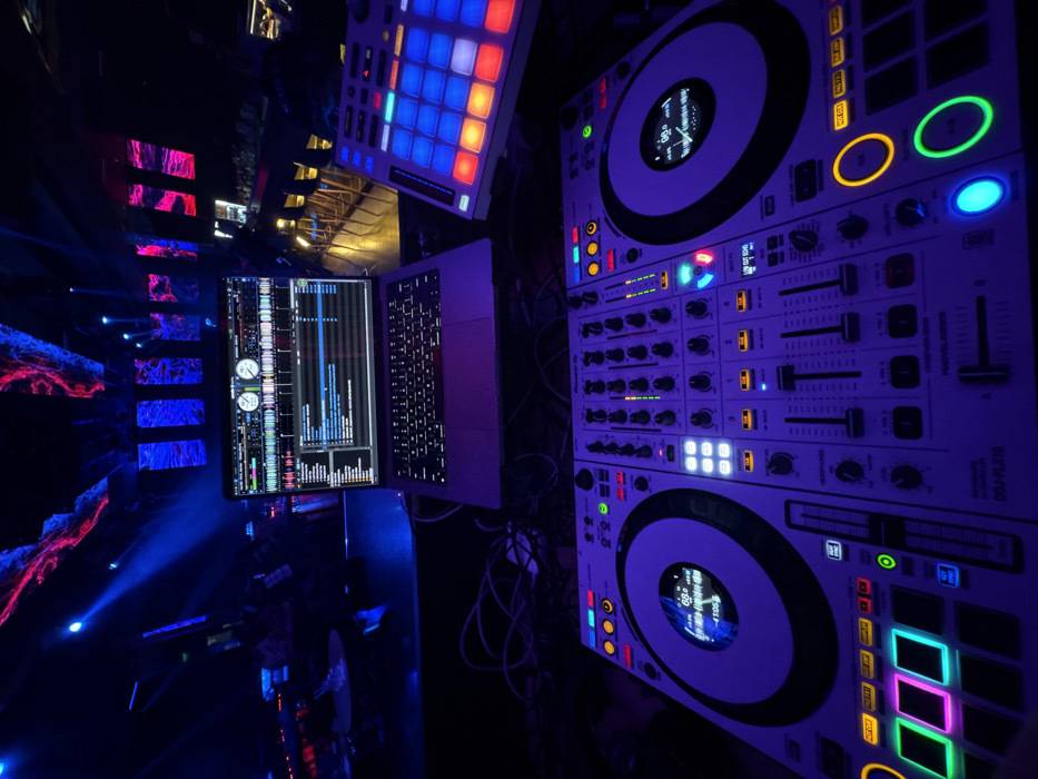 The image displays a professional DJ setup situated in a dimly lit entertainment venue