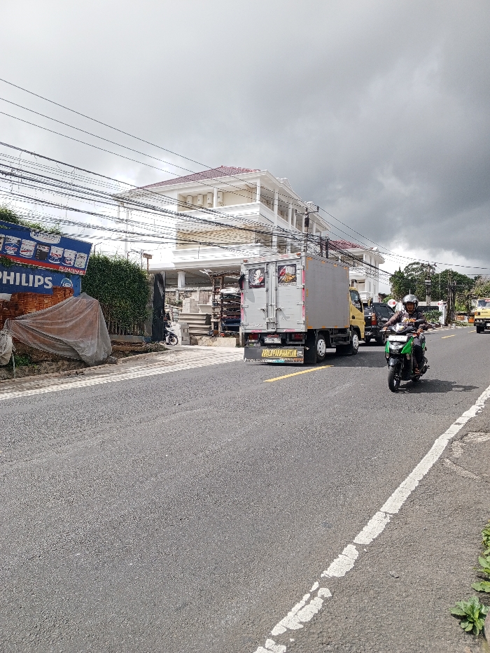 The image depicts a street scene in Catarman, Philippines, under an overcast sky. A two-lane asphalt road, marked with a white broken edge line on the right and a yellow solid line on the left, runs from the foreground towards the background. In the right lane, a person wearing a white helmet and dark clothing operates a green and black scooter, traveling away from the viewer. Directly behind and to the left of the scooter, in the same lane, is a light grey box truck with a dark bumper and a yellow strip, featuring several decals on its rear doors. Behind the box truck, a yellow truck and other vehicles are visible further down the road. On the left side of the road, a prominent multi-story building with white facades and a red-tiled roof stands set back behind a green hedge. The building features multiple balconies and numerous external air conditioning units mounted on its upper levels. A "PHILIPS" sign, predominantly blue with white text and images of paint cans, is partially visible on the far left, partially obscured by the hedge. An object covered with a light-colored tarp is situated near the Philips sign. Numerous overhead power and communication lines traverse the upper left portion of the frame. Small plants grow along the right edge of the road.