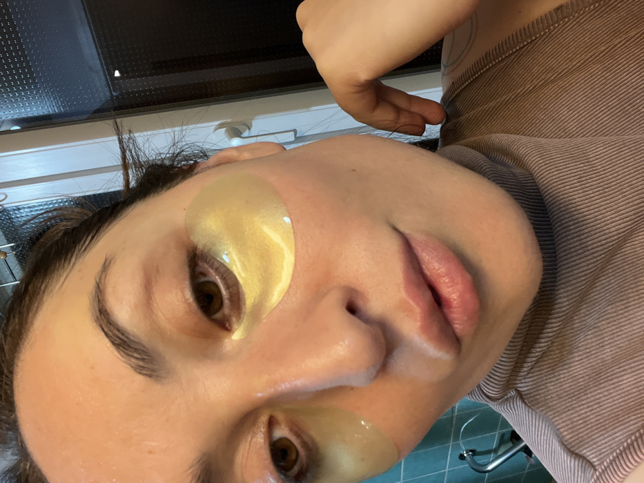 A person's face is seen in a close-up, angled view. They have under-eye gel patches. Their eyes are brown. The skin is fair with some shine. Lips are full and a natural pink. Parts of the upper body are visible, wearing a neutral-toned, ribbed garment. The background shows part of a room with a tiled floor and appliance.