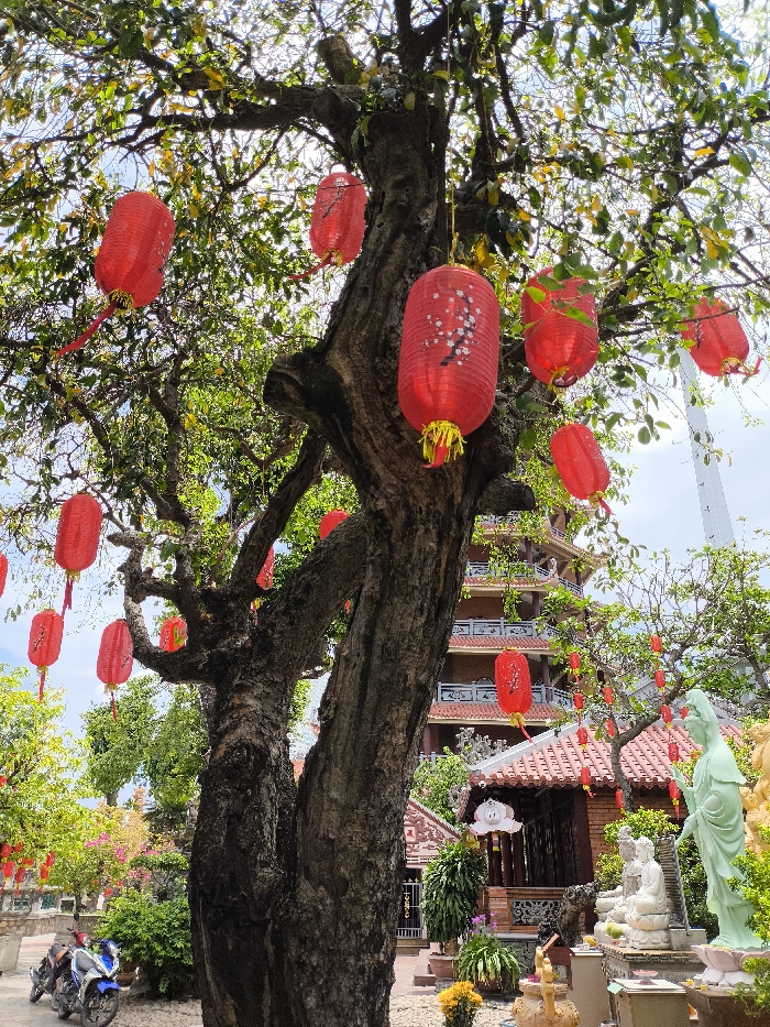 The image captures an outdoor scene within the Thien Hung Pagoda complex in Quy Nhon City, Vietnam