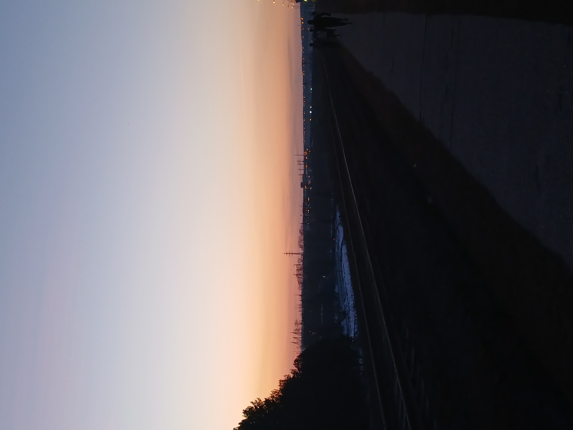 The image depicts a sunset over a landscape near the city of Chaikovsky, Russia. The sky exhibits a gradient of colors from light blue to orange. A dark silhouette of trees and vegetation is visible in the foreground. The horizon is punctuated by the outlines of buildings, industrial structures like power lines, and city lights. A road or walkway occupies the right side of the image, with indistinct figures of people walking. The overall scene presents an urban or suburban landscape at dusk.