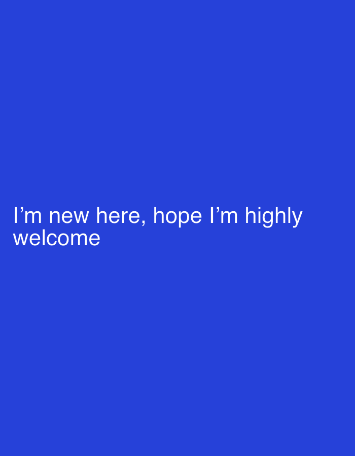 The image displays a solid, vibrant blue background with white text positioned in the lower-left quadrant. The text reads, "I'm new here, hope I'm highly welcome." The font is simple and clear, providing high readability against the blue backdrop. Overall, the composition is minimal and focused, conveying a message of introduction and anticipation.