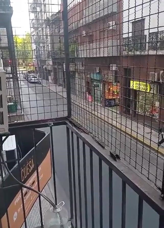 view of a street from a balcony. The balcony has a metal railing and is enclosed by a wire mesh cage. On the balcony, there is an air conditioning unit, a sign for "CUESA", and a plastic bottle with a tube attached. The street below is lined with buildings, mostly two to three stories tall. Some of the buildings have shops on the ground floor. Several people are walking on the sidewalks. Cars and motorcycles are parked along the street, and some are driving by. There's a fair amount of litter on the street. The weather appears to be overcast. A person on a bike rides down the street. Sirens are audible.