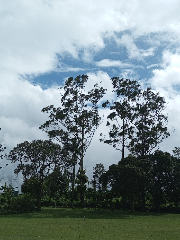 The image displays an outdoor landscape in the city of Unknown, Vietnam, under a sky featuring white cumulus clouds with discernible patches of blue. The foreground consists of a meticulously maintained, short-cut green grassy field. Centrally located within this field is a single, slender, light-colored pole, likely a flagpole. The midground and background are densely populated with various trees. Two prominent, tall, and slender trees with sparse dark green foliage concentrated in their upper canopies stand out in the central composition. Behind these, a thick line of assorted green trees and dense undergrowth forms a verdant backdrop. On the far left, a glimpse of a light-colored structure and a dark cylindrical object, possibly a water tank, is visible amidst the vegetation. No human subjects, actions, or interactions are present in the scene.