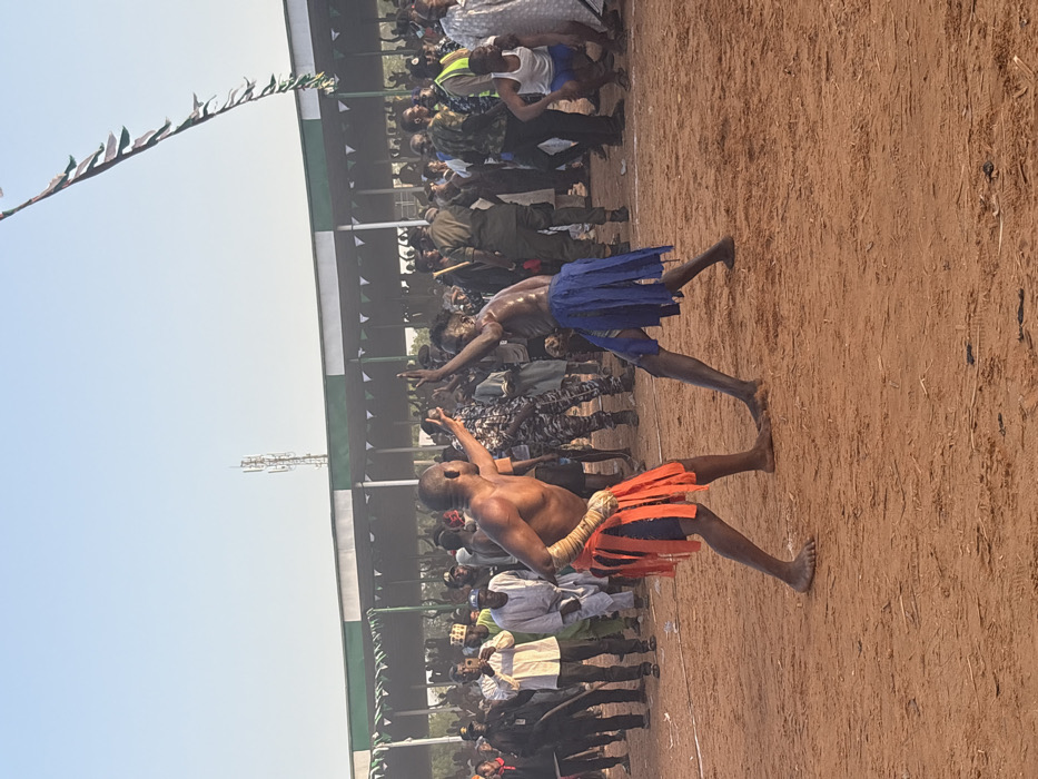 Two shirtless male wrestlers wearing colorful skirts compete in a sandy arena