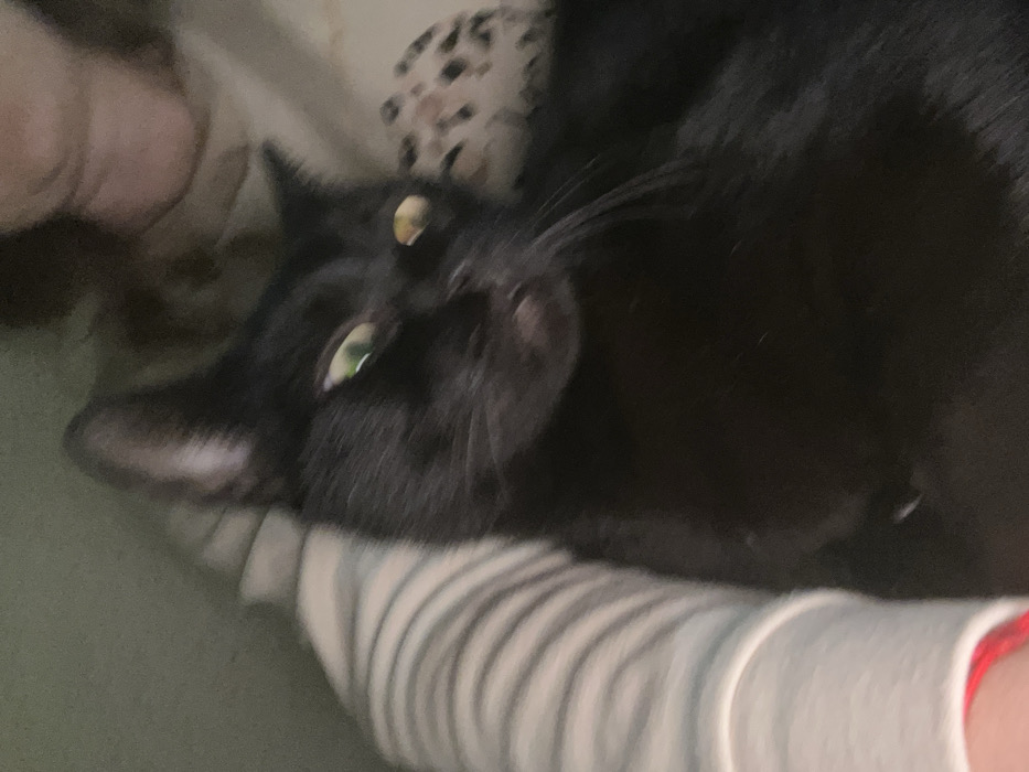 - "The image displays a black cat resting on a person in an indoor setting within the city of Karmiel, Israel" by FM-sApNa2, licensed under CC BY 4.0