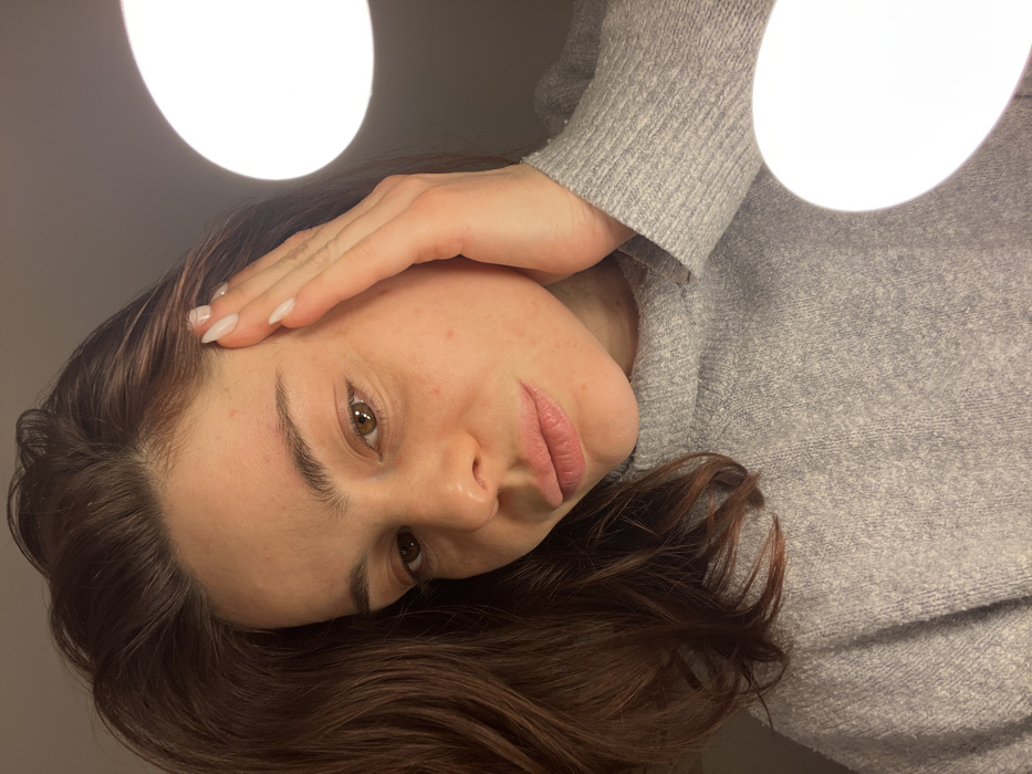 A woman with brown hair and fair skin faces the camera. Her left hand rests on her forehead. She wears a gray sweater. Two bright, circular lights frame the top corners of the image. The woman's gaze is direct, and her expression is soft. Skin blemishes are visible. Her lips are naturally pink. The background appears to be a neutral color.