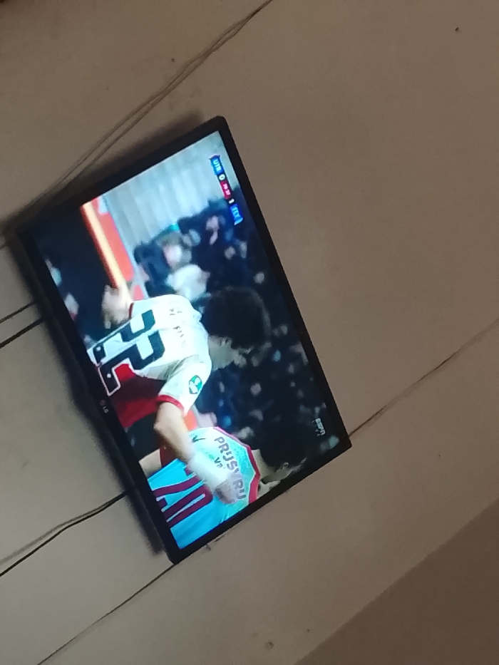 An indoor scene in Masaka, Nigeria, displays a black flat-screen television angled diagonally against a light-colored, possibly off-white, wall