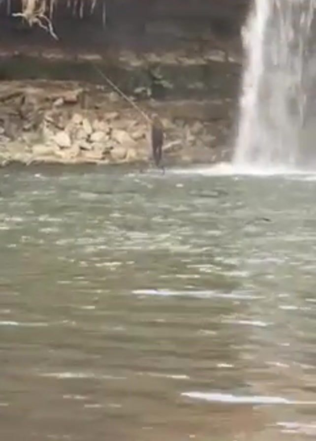 A distant figure stands in the water at the base of a waterfall. The waterfall is tall, with water cascading down from a rocky overhang. The water body in front of the waterfall is still, with some ripples on the surface. Icicles hang from the rock overhang. The environment appears to be a natural area with trees visible at the edge of the frame.