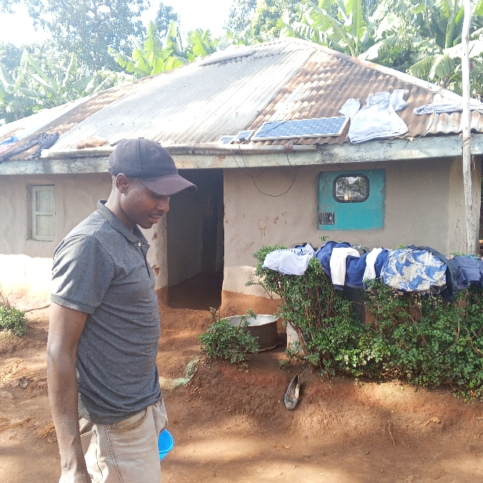 The image displays an outdoor scene in Getenga ward, Kenya. A single adult male is positioned in the left foreground, oriented to his right with his head slightly bowed. He wears a black baseball cap, a grey short-sleeved polo shirt, and light-colored trousers, holding a small blue container in his left hand. Behind him stands a single-story house with light-colored walls, likely plaster over an earthen structure, and a weathered, corrugated metal roof. Two small solar panels are mounted on the roof slightly off-center to the right, with a white garment draped over the roof adjacent to them. A small, light-colored wooden window frame is visible on the house's left side. A dark, open doorway is centrally located on the house's facade. To the right of the doorway, a teal-colored metal box with a small reflective square is affixed to the wall, with wires extending from it. Green bushes line the base of the house in the mid-ground, over which various items of clothing are draped for drying. On the reddish-brown soil in front of the bushes, a metal basin and a single dark-colored shoe are visible. The background consists of lush green, large-leafed trees, indicative of banana plants. The scene is illuminated by strong daylight.