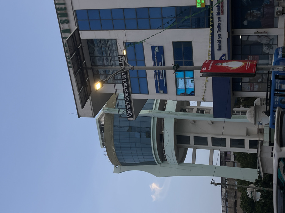 The image depicts an urban street scene in Zanzibar, Tanzania. A tall, modern, light-colored building on the left features a distinctive, multi-story, curved glass-paneled upper section resembling an observation deck, supported by a central column. Adjacent on the right is a white multi-story building with multiple blue-tinted rectangular windows. This building displays a blue sign indicating "MINISTRY OF FINANCE, TANZANIA INSTITUTE OF ACCOUNTANCY (TIA) ZANZIBAR CAMPUS" and a black sign for "Ngenda Construction Ltd". A multi-panel digital display is visible within a window. The ground level of this building includes a dark blue commercial facade, partially showing "Benki ya Taifa ya Biashara". A street light pole with two active yellow luminaires and an overhead solar panel array stands prominently in the foreground, partially obscuring the right building. A red vertical advertising banner depicting a lightbulb is attached to the pole. Vehicle roofs are partially visible at the bottom of the frame. The sky is light blue with minor cloud cover.