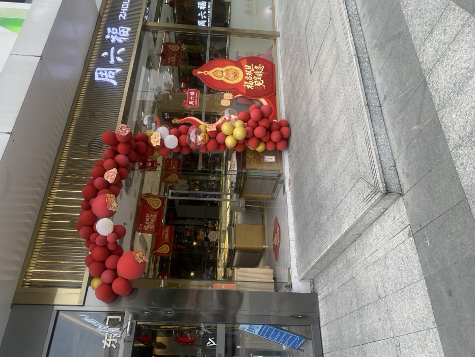 A storefront is adorned with a large, festive balloon arch in red, white, and gold colors. Chinese characters for "Zhou Liu Fu" and "Fu Qi Shuang Dan Jian Bao Fei Yi" are prominently displayed. The store has a glass facade, allowing a view of interior furnishings. Red decorative accents are also placed on the glass. A series of steps rise on the right side of the frame.