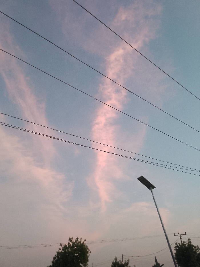 The sky is light blue with streaks of pale pink clouds. Several black power lines run horizontally across the scene. A tall, gray light post stands in the lower right, its rectangular head tilted upward. Below, green trees and more utility lines are visible. The scene evokes a serene, almost dreamlike atmosphere.