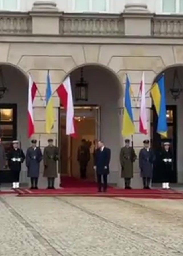 man standing in front of a building flanked by flags of Poland and Ukraine. He is standing on a red carpet. There are soldiers or guards standing on either side of the red carpet, facing forward. The building is white and has arched doorways. The courtyard is paved with stones. The man is wearing a dark suit. There is another person walking in the doorway behind him. A command in Polish is spoken.