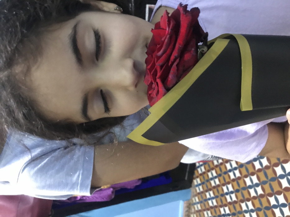 The image displays a young female indoors, located in Ouislane, Morocco. She is presented in a close-up, mid-shot, with her head slightly tilted and eyes closed, actively smelling a single dark red rose. The rose is securely wrapped in black paper featuring a gold-colored trim. The female has dark, curly hair and wears a light purple short-sleeved top. A small, round, metallic earring is visible in her right earlobe. Partially visible in the upper left background is the torso and upper arm of a second individual, wearing a light grey short-sleeved garment. The floor exhibits a multi-colored geometric tile pattern in hues of brown, white, and blue. To the far left, a segment of a light blue wall or partition is visible, alongside indistinct hanging items of clothing in purple and dark blue tones.
