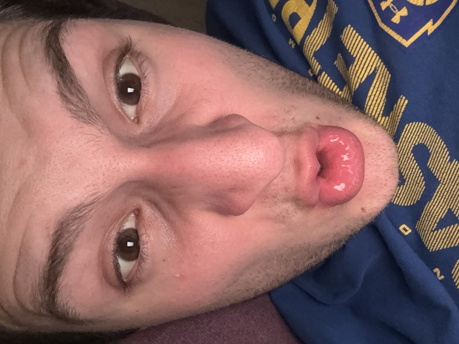A close-up, head-on portrait of a male subject, located in Novate Milanese, Italy. The individual has dark brown eyes, visible dark eyebrows, and a light complexion exhibiting minor redness around the nose and cheeks. His mouth is actively pursed into an 'O' shape, with both lips appearing glossy. Short stubble is present on his chin and jawline. He wears a blue garment with yellow markings; specifically, partial 'Under Armour' branding is discernible on the right chest area. A purple textile surface is partially visible behind the left side of his head and shoulder. The lighting is direct, illuminating the face from the front.