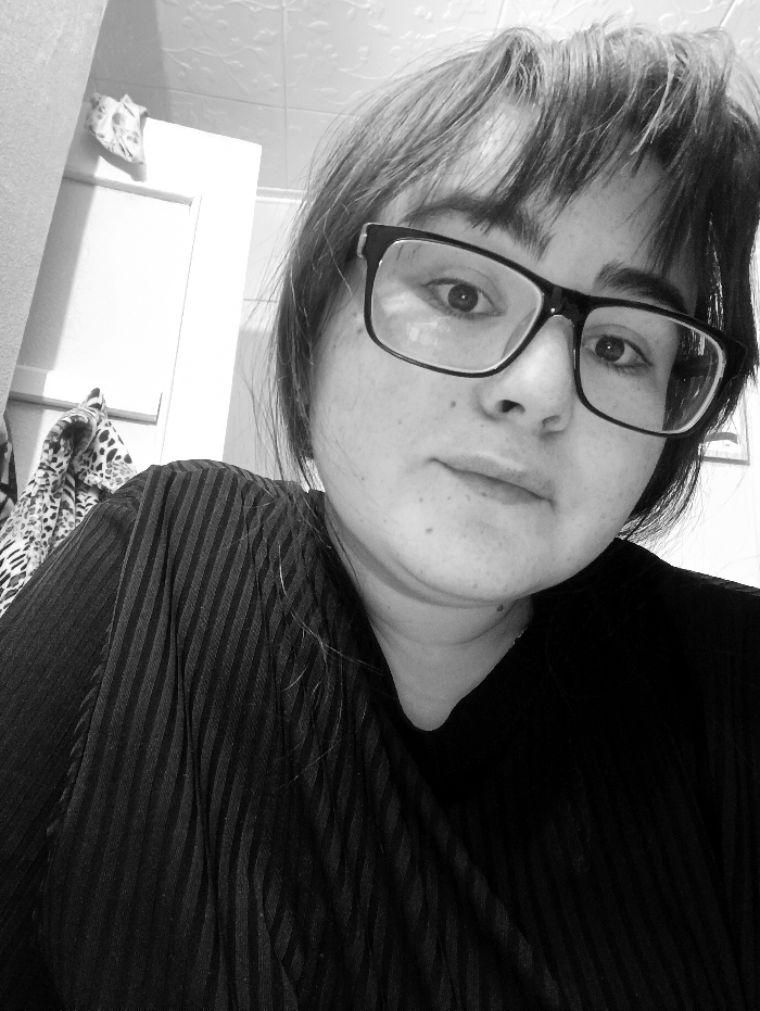 - "A black and white selfie depicts a person with dark hair and bangs, wearing glasses with thick black frames" by FM-eOjCF2, licensed under CC BY 4.0