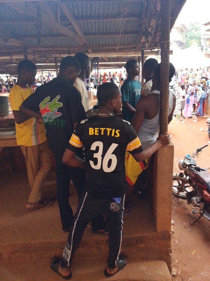 The image depicts an outdoor market or public gathering area in Alor, Nigeria, under a rudimentary shelter with a corrugated metal roof supported by wooden beams and concrete pillars. In the mid-ground, seven males are standing. A central male figure, viewed from the back, wears a black athletic jersey with "BETTIS" in yellow and "36" in white, black track pants with white side stripes, and dark flip-flops. He leans his right hand on a light-brown concrete pillar. To his left, another male in a grey tank top and yellow shorts also leans on the pillar. Behind the central figure, a male wears a black t-shirt with a multi-colored Lacoste crocodile logo on the back. To the left, a male in a yellow t-shirt and light brown pants stands near a wooden counter. Another male in a dark green t-shirt is visible further back. The ground is packed earth. In the bright background, a large crowd of people in varied attire is visible in an open area, alongside temporary white tents and distant buildings with reddish roofs. A red and silver motorcycle is partially visible, parked on the dirt ground to the right of the concrete pillar.