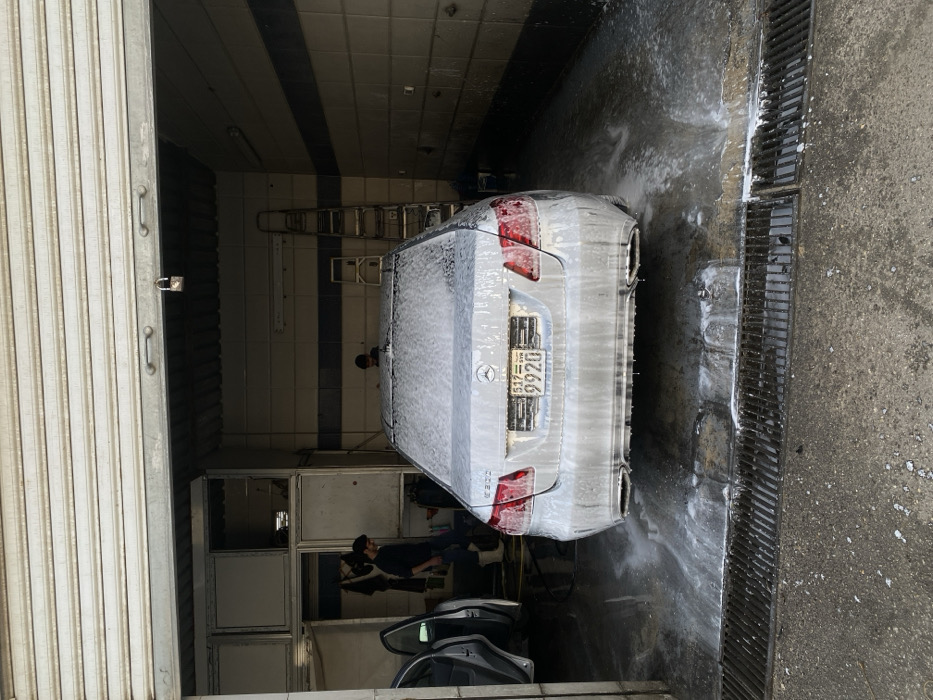 An image taken in Ma'raba, Syria, depicts the interior of a car wash bay with a silver Mercedes-Benz E 300 sedan centered, facing the viewer, and covered in white soap suds