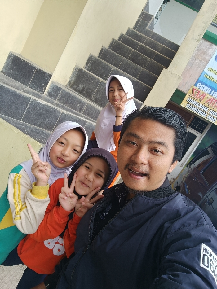 A selfie shows a man with a mustache, wearing a navy blue jacket, with three young girls. The girls are making peace signs and pointing. Two girls wear headscarves, one white and the other patterned. Another girl wears a purple hooded head covering. The group stands on what appears to be stairs. A window and signage are visible in the background, along with a car. The photo seems taken outdoors.