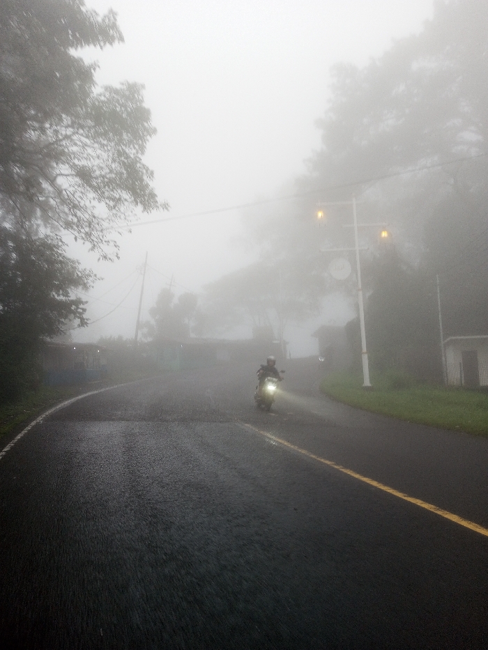 The image depicts a foggy road scene in Dawathang_Dorjibi_ Kashingtsawa, Bhutan