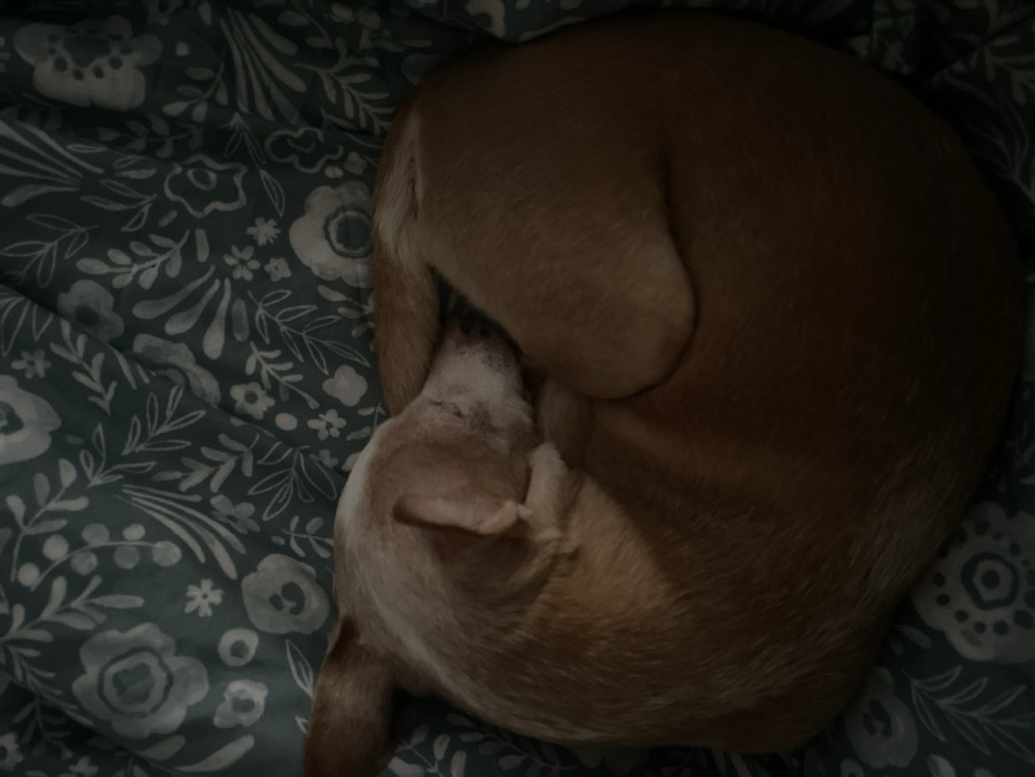 - "An overhead view depicts a light brown and tan-colored dog, likely a smaller to medium-sized breed, curled tightly into a sleeping posture" by FM-S3I4c2, licensed under CC BY 4.0
