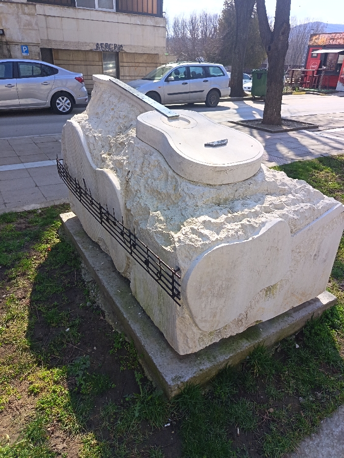 The image displays a large, light-colored stone sculpture situated on a grassy area in the city of Mezdra, Bulgaria. The sculpture, a monolithic block of rough-hewn stone, features a stylized guitar body carved in relief, with a smoother, lighter-colored stone component forming the guitar's soundboard, including a circular sound hole and bridge elements. A flat, rectangular stone segment extends from the guitar body, representing its neck. A black metal musical staff, adorned with several black musical notes, is affixed horizontally to the lower left side of the main stone block. The entire sculpture rests on a rectangular concrete base. Immediately behind the sculpture, a paved sidewalk abuts a two-lane asphalt road. A silver sedan and a light-colored station wagon are parked or moving on the road. To the left of the road, a multi-story building with a light-toned facade is visible, featuring windows and a sign bearing the Cyrillic text "АГЕНЦИЯ" (AGENCY), alongside a blue 'P' parking sign. To the right, a deciduous tree with bare branches stands on a paved section, with a green dumpster partially obscured behind it. Further in the distance on the right, a red kiosk or small structure is visible. The sky is clear, indicating daylight conditions. No individuals are depicted in the scene.
