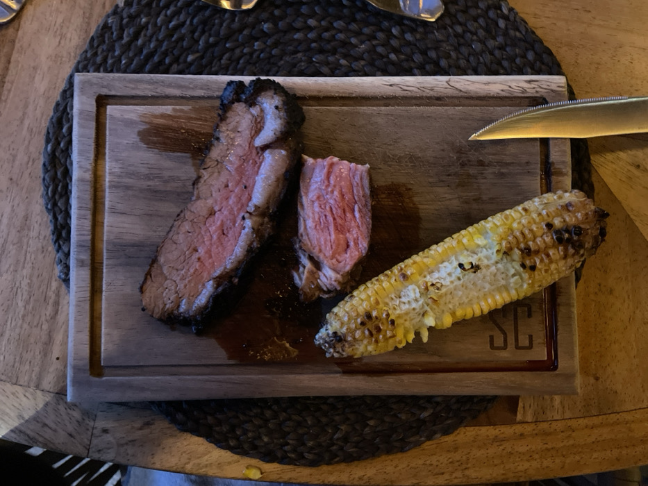 The image presents an overhead view of a prepared meal served on a rectangular wooden cutting board. Two slices of cooked meat, exhibiting a dark, seared crust and a distinct pink, medium-rare interior, are positioned on the upper half of the board, surrounded by accumulated juices. Below the meat, a grilled ear of corn, partially consumed with missing kernels revealing the white cob, lies diagonally. The corn displays yellow kernels with visible charring. The wooden cutting board features a shallow juice groove along its perimeter and a branded mark, appearing as "SC" or "SG," in its lower-left area. A silver-colored serrated knife blade is partially visible along the right edge of the board. The cutting board rests on a dark, tightly woven placemat, which in turn is situated on a light brown wooden table. The scene is illuminated by warm, ambient lighting. No individuals are present. The precise location within Avandaro, Mexico, is not visually identifiable from the image.