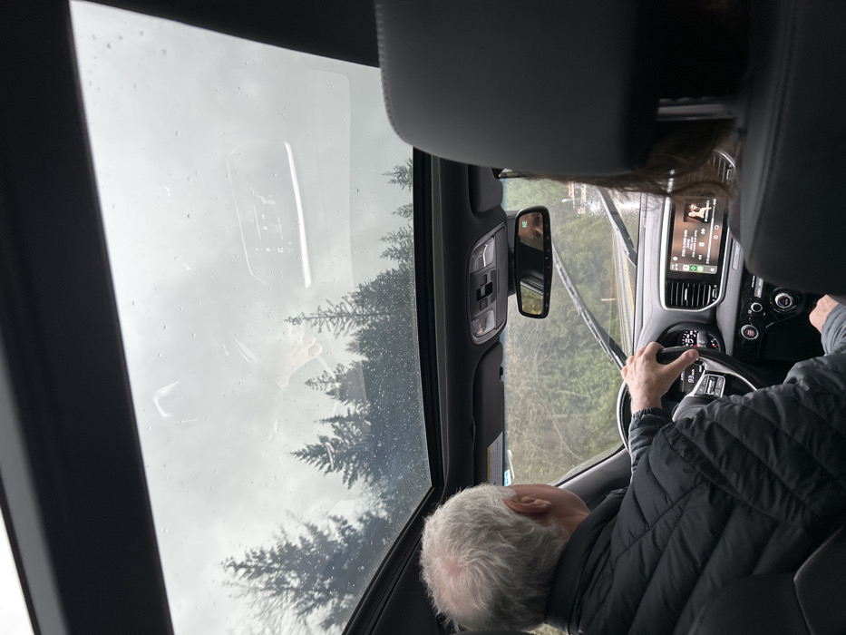 Inside a car, an older man with white hair grips the steering wheel. Rain streaks across the panoramic sunroof, revealing overcast skies and a line of trees. The dashboard displays navigation and music. A rearview mirror is visible above the center console. The man wears a dark quilted jacket.