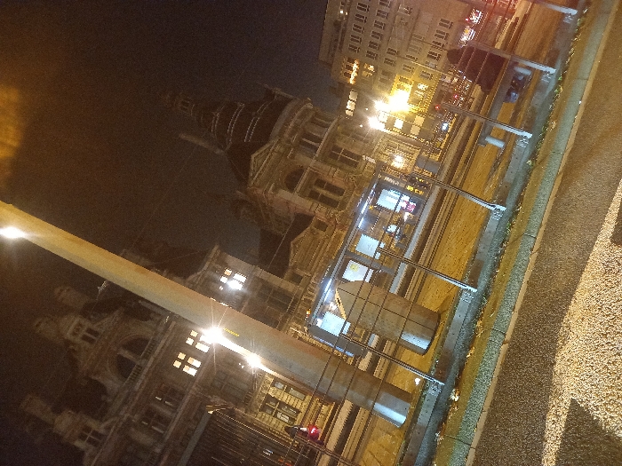 A nighttime shot depicts a tall, ornately designed building with a prominent spire, partially obscured by darkness. The building is illuminated by internal and street lighting. A street runs adjacent to the building, featuring guardrails with metal posts. The road surface is textured, possibly asphalt, and a portion of a nearby building with numerous windows is visible in the background.