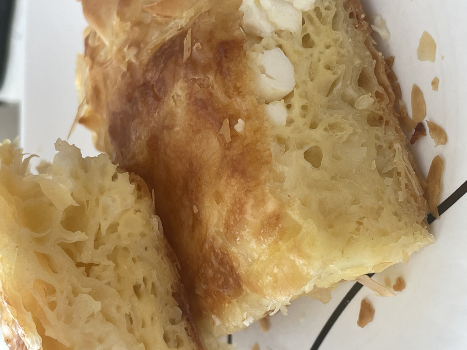 - "The image displays a close-up, high-angle view of two pieces of baked pastry, consistent with a traditional Balkan banitsa or börek, resting on a white ceramic plate" by FM-waRT52, licensed under CC BY 4.0
