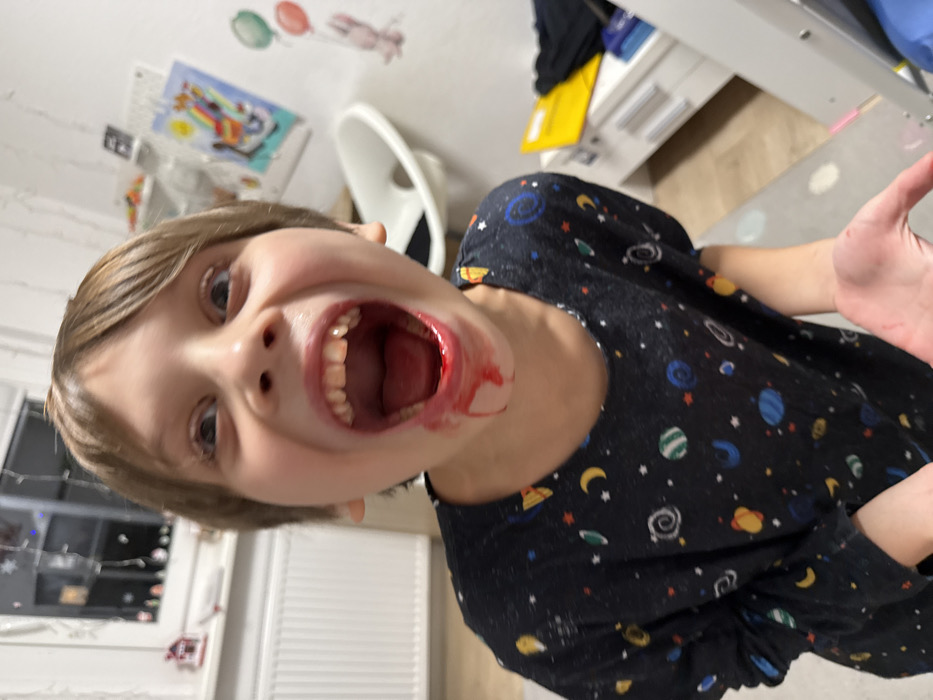 A child with blond hair is displayed at an angle, his mouth wide open showing blood on his lips and teeth